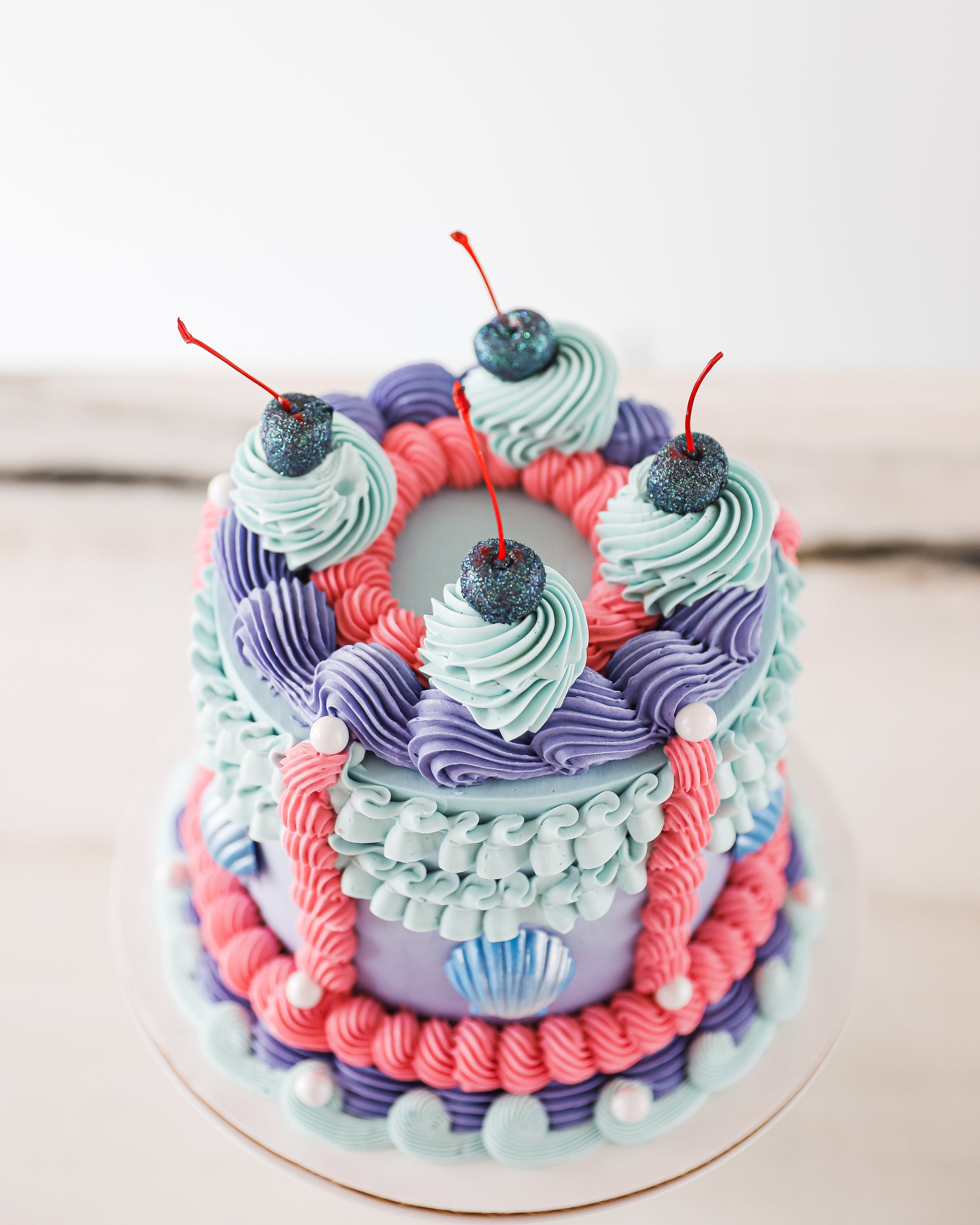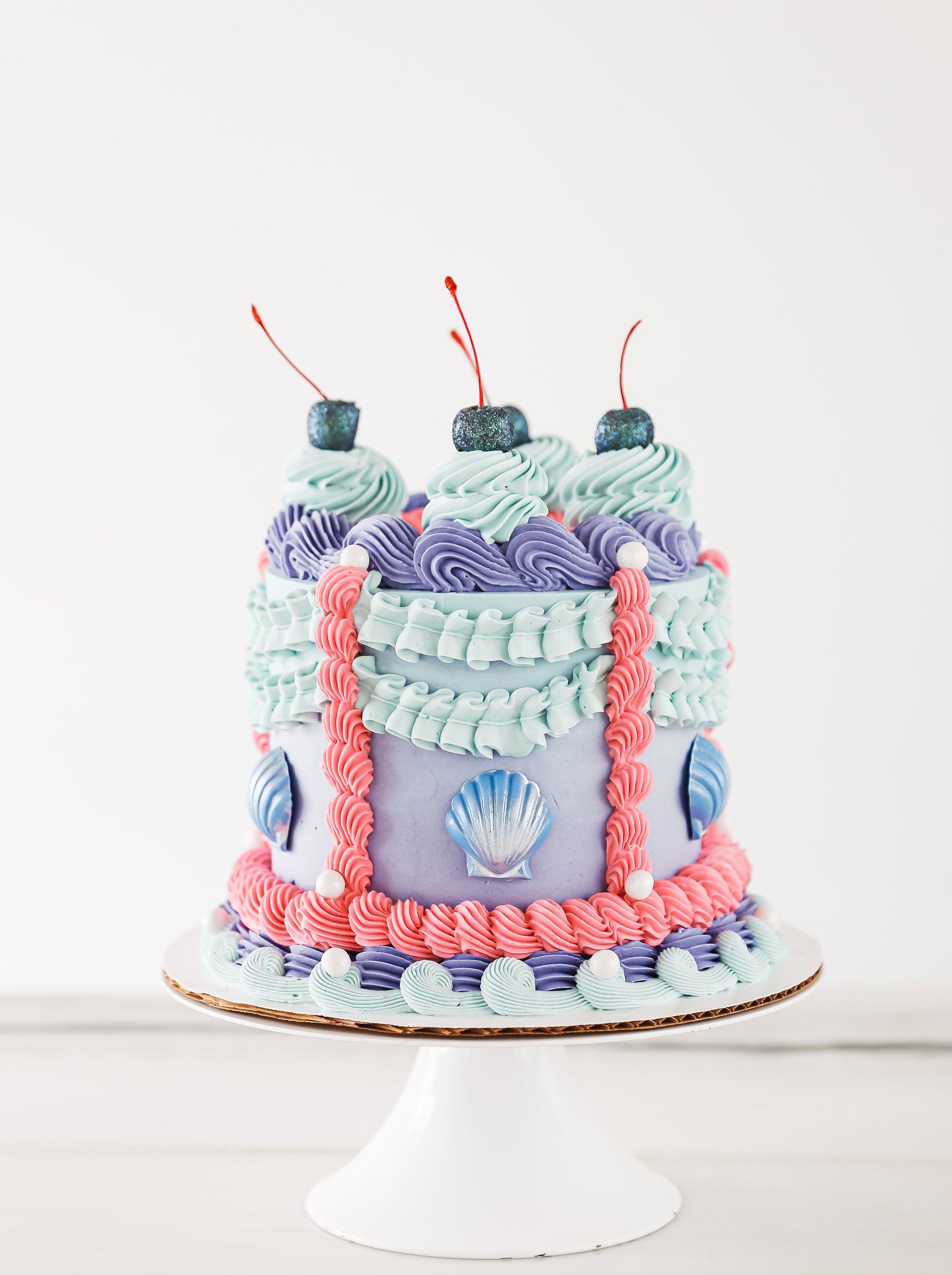 You can make your day magical with our Ariel Cake, the most graceful and colorful vintage buttercream creation. It features hand-piped designs, glitter cherries, and chocolate sea shells for a whimsical touch.