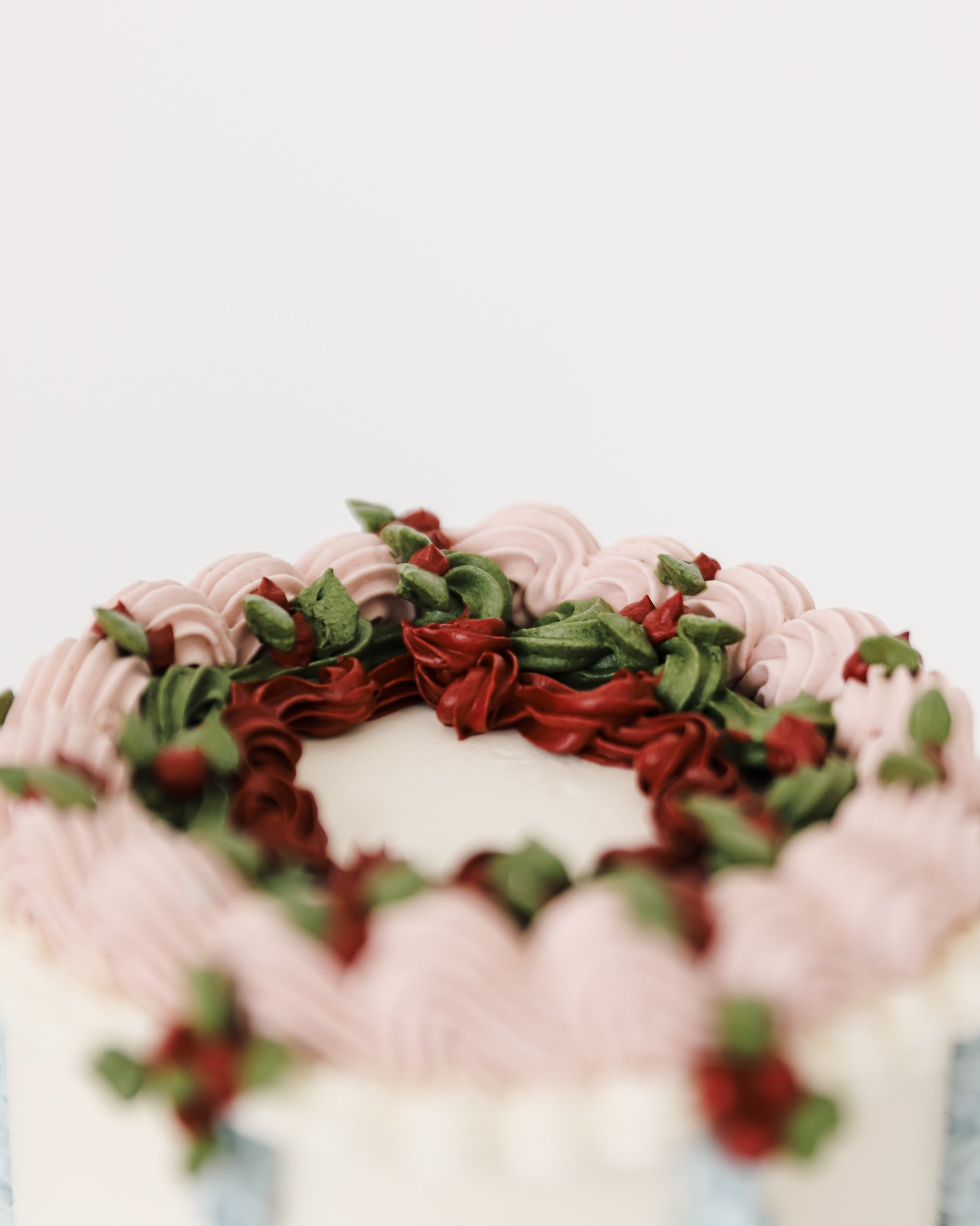 Meet the Holiday Mini Lambeth Cake Gift Box, a charming vintage-style centerpiece inspired by classic Nutcracker tones. This petite cake is decorated with intricate lambeth piping in beautiful shades of red, blue, pink, and green, complete with hand-piped mistletoe and delicate scalloped detailing for a nostalgic, heirloom-inspired finish.