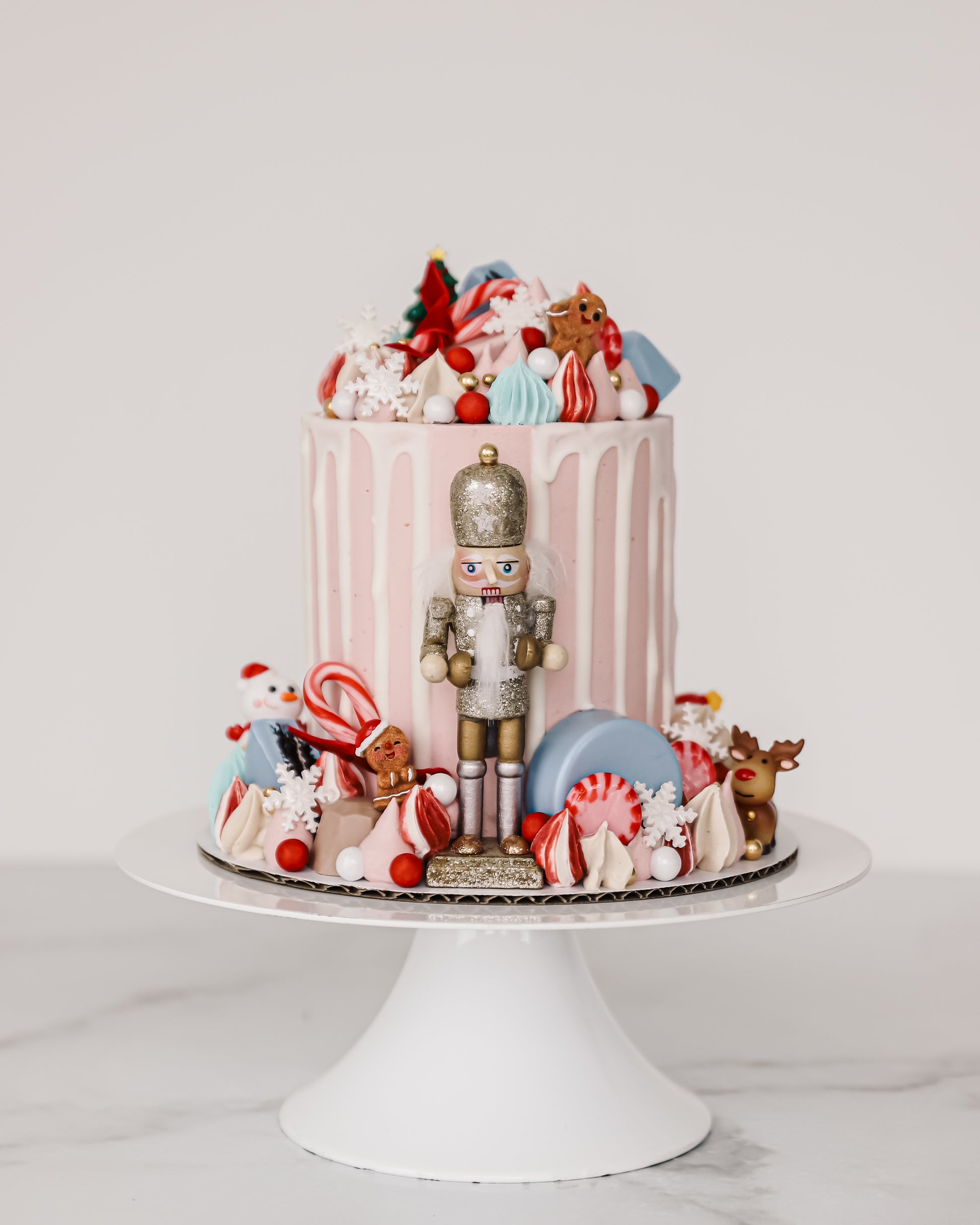 The Santa and Friends Holiday Cake is a whimsical centerpiece in our Earth and Sugar Christmas collection. Designed to celebrate the magic of the season, this festive cake features a glittered keepsake Nutcracker, paired with charming non-edible characters such as Santa, Rudolph, gingerbread friends, snowmen, and miniature trees. These keepsake pieces can be treasured long after the cake is enjoyed.