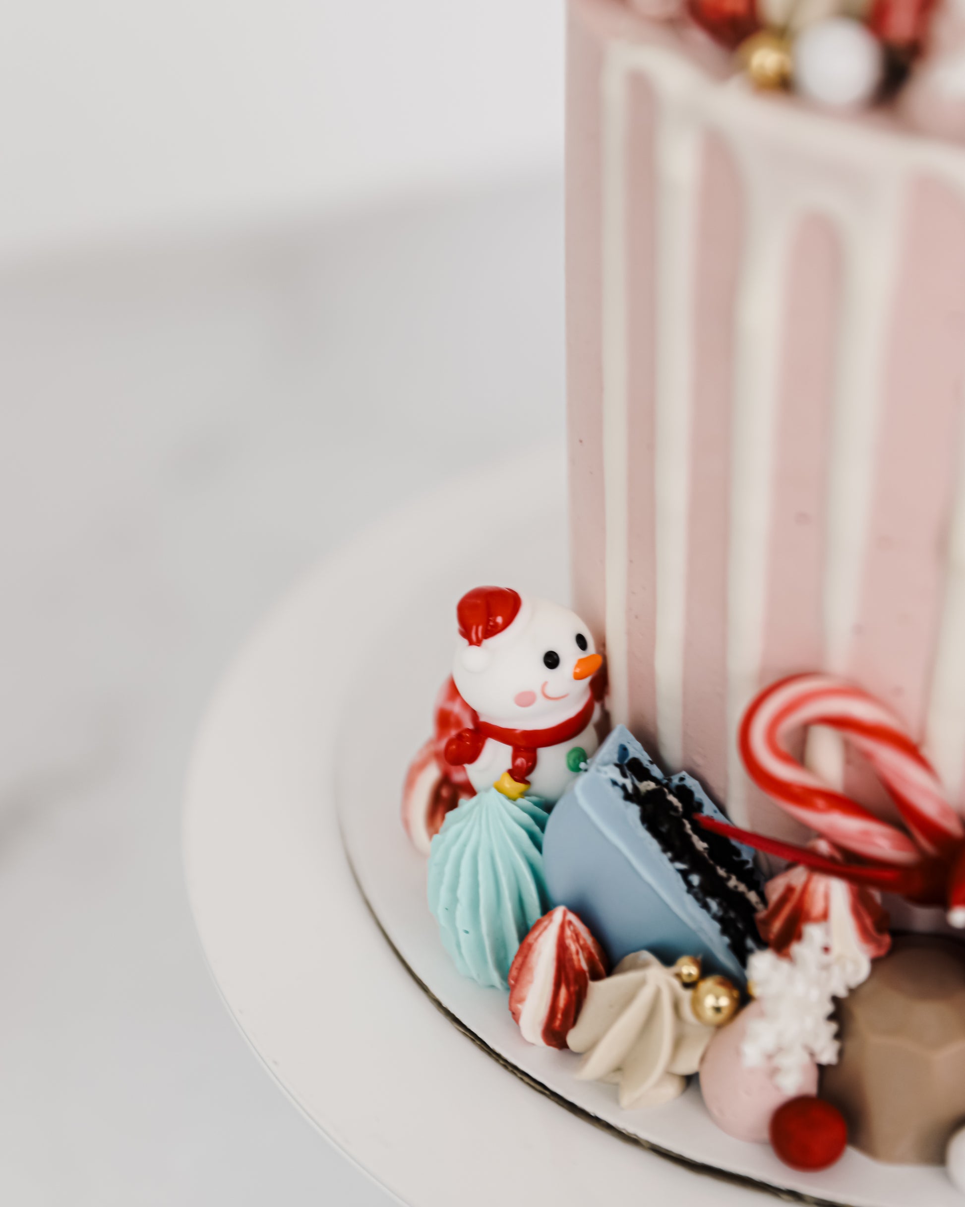 Each cake is decorated with a curated assortment of holiday confections—including Oreos, chocolate gems, fondant snowflakes, candy canes, edible pearls, sprinkles, and seasonal textures in matching theme colors.