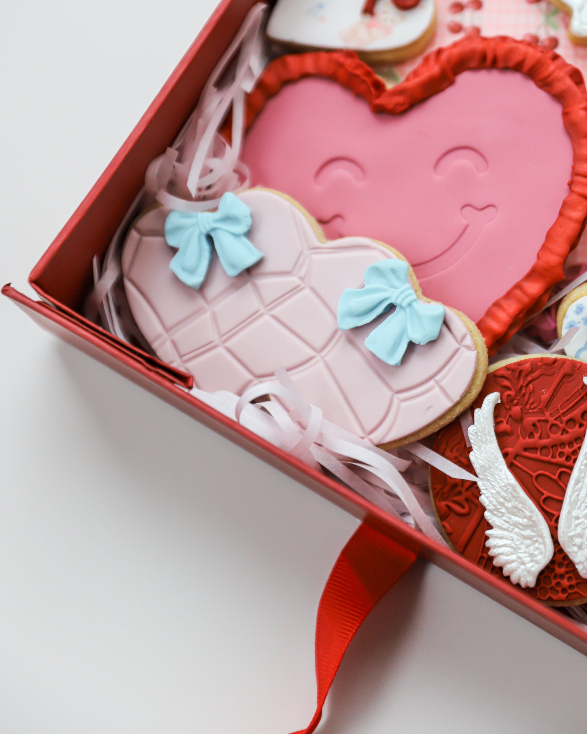 Inside, you’ll find a mix of heart‑shaped cookies in soft pinks, blues, and reds, decorated with delicate piping, pearl accents, sweet bows, angel details, and playful Valentine designs. Each cookie is carefully decorated to feel special, cheerful, and perfect for the season.