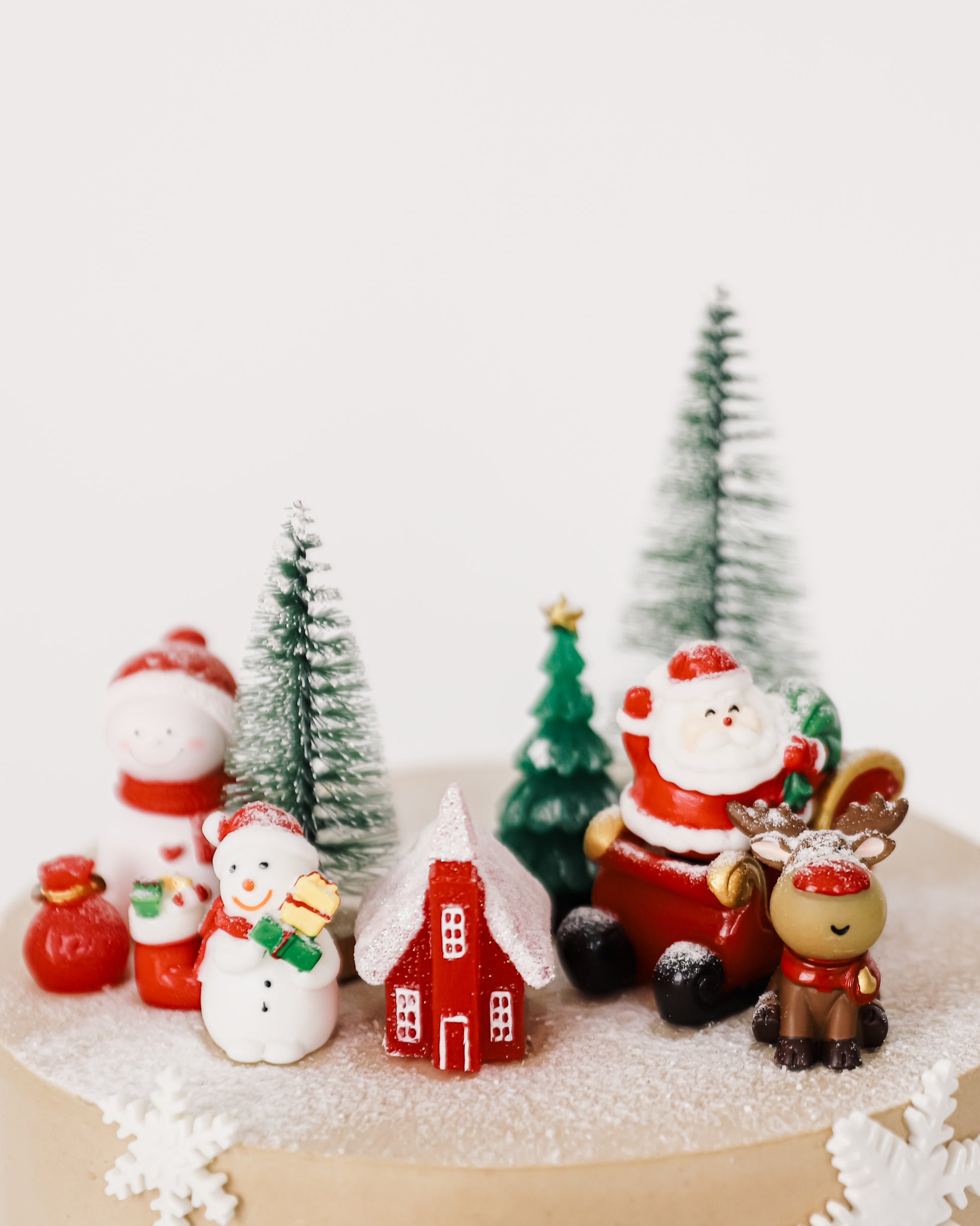 The cake is finished with edible snow sugar, a mini holiday wreath, and pearlized edible snowflakes for that perfect frosted glow. A whimsical design that photographs beautifully and brings a nostalgic storybook feel to any celebration.
