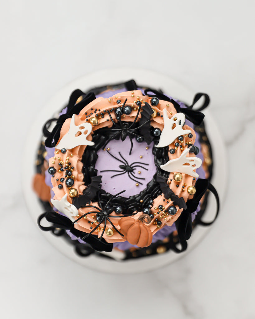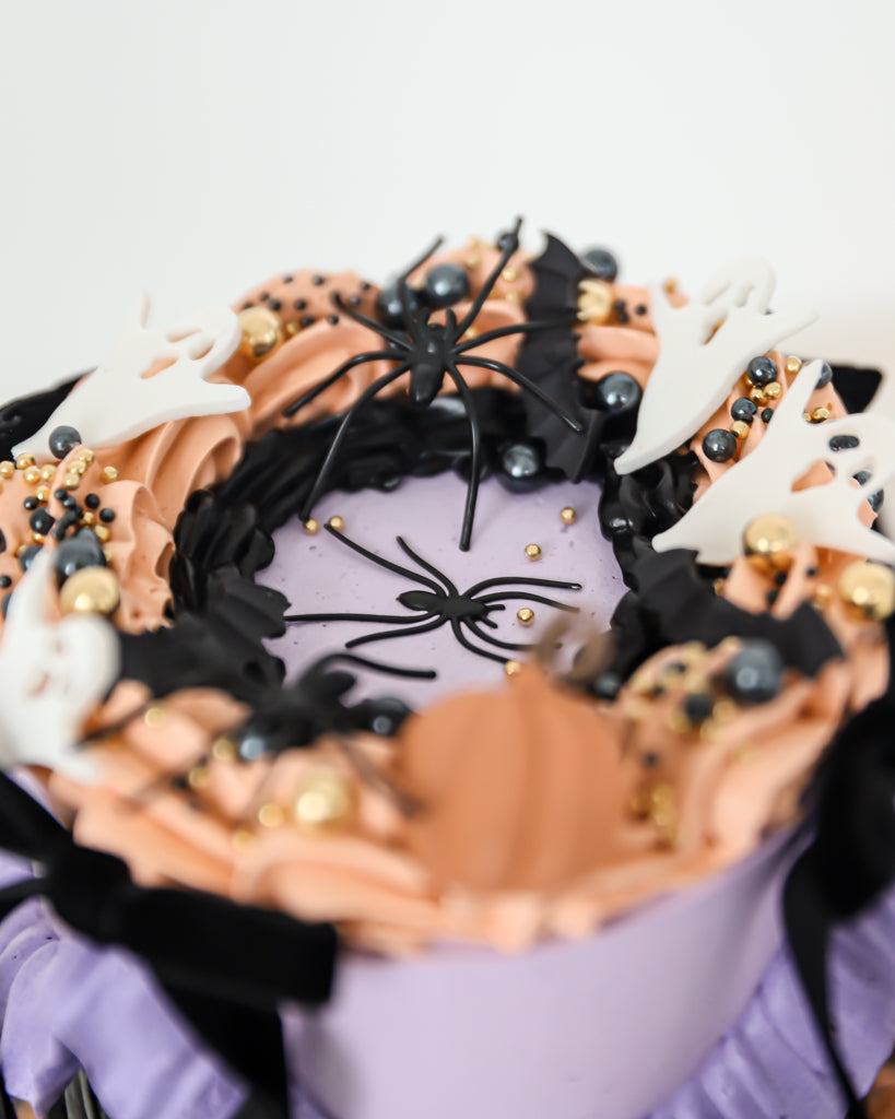 Our Spooky Vintage Mini Cake is the perfect centerpiece for spooky season. This petite 4" cake features intricate vintage piping, finished with elegant black ribbon bows and classic Halloween décor of hand-crafted ghosts, pumpkins, and spider decor. Ideal for intimate gatherings, gifting, or adding a touch of eerie elegance to your celebration, this cake blends nostalgic design with festive flavor. Available in a variety of flavors, perfect for local pickup or delivery.
