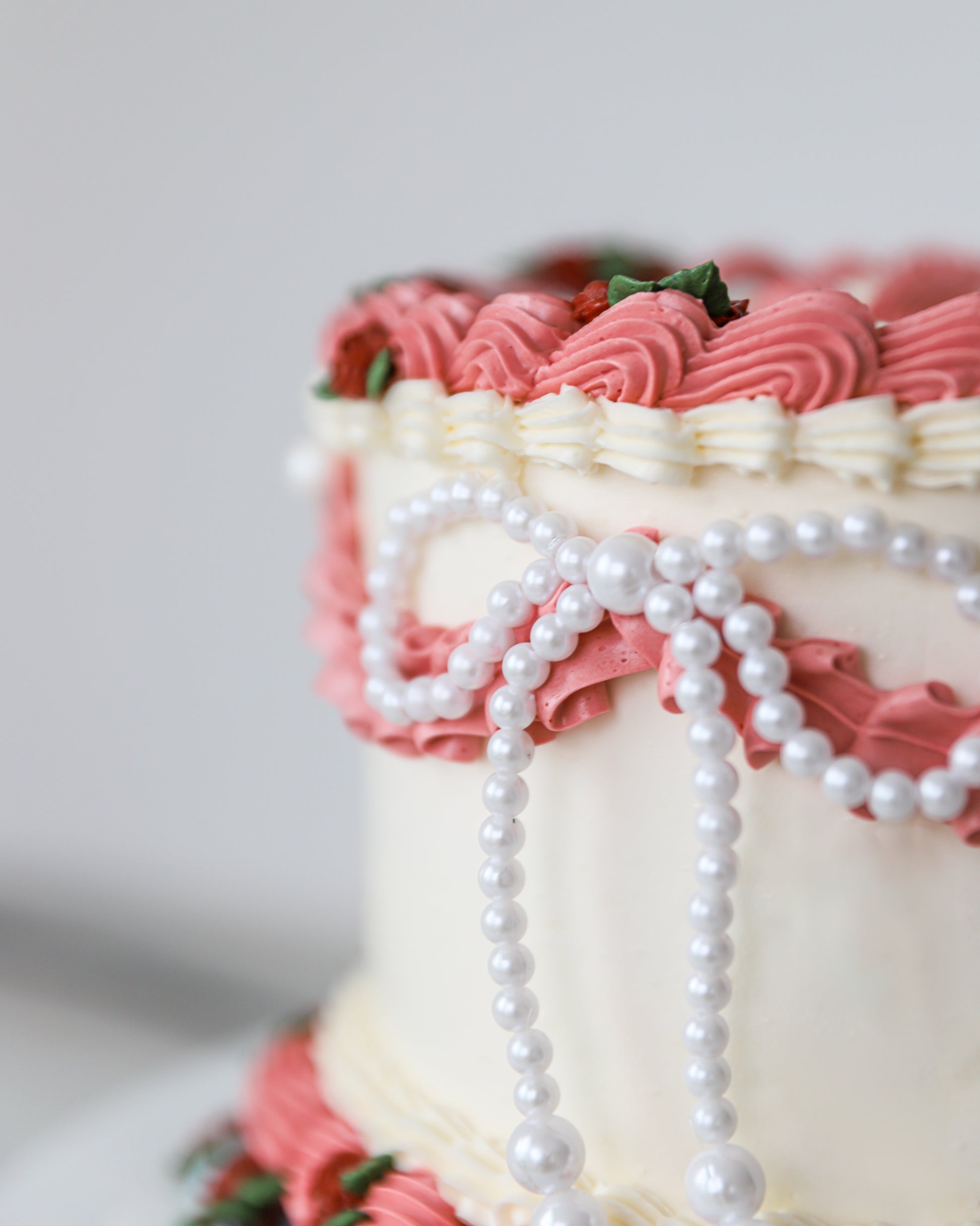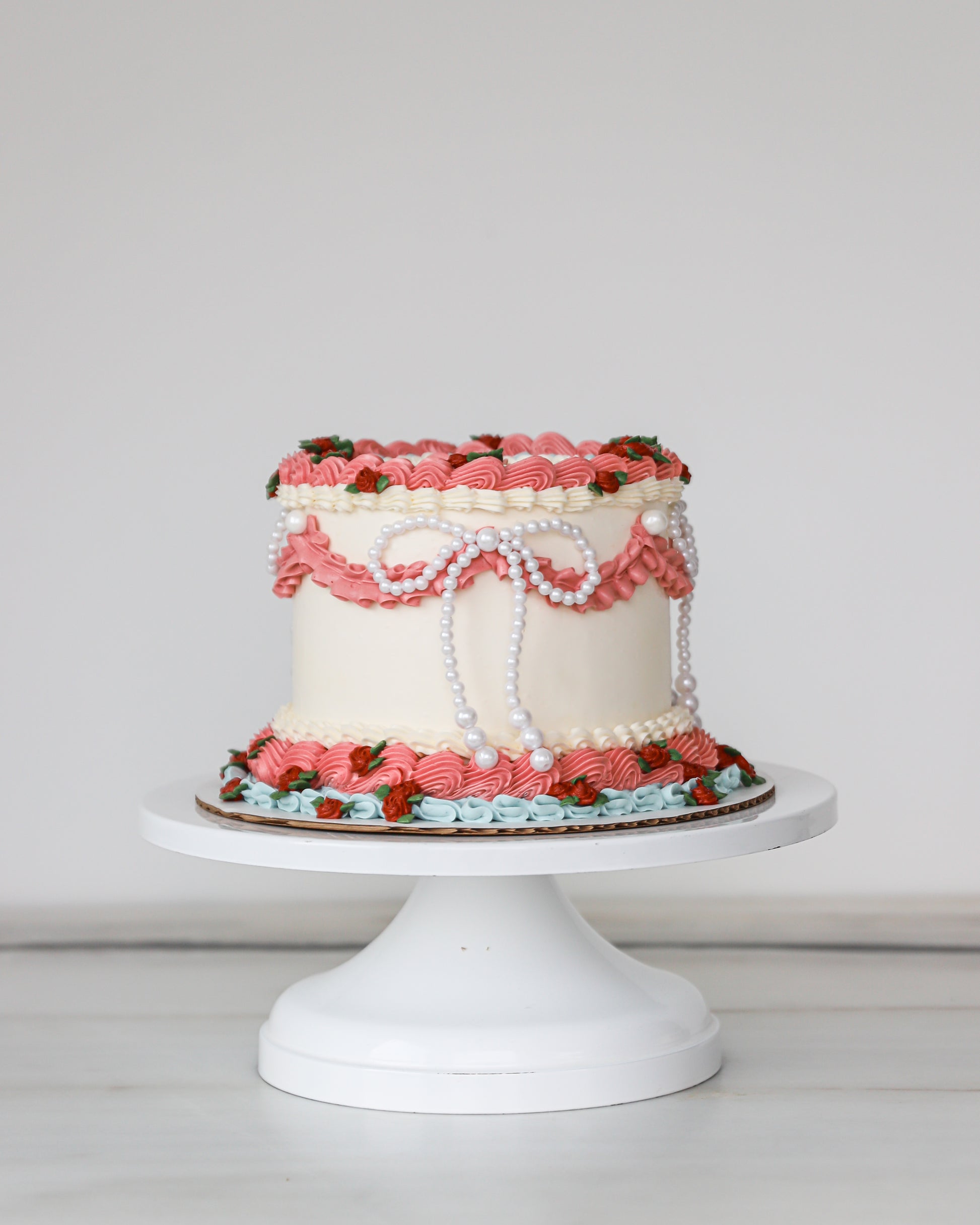 The Valentine Pearl Charm Cake is a whimsical and romantic dessert designed to bring a touch of vintage charm to Valentine’s Day celebrations. Finished in smooth buttercream and decorated with soft pink, cream, and light blue piping, this cake features a piped heart on top and elegant pearl details draped around the sides for a playful, nostalgic look.