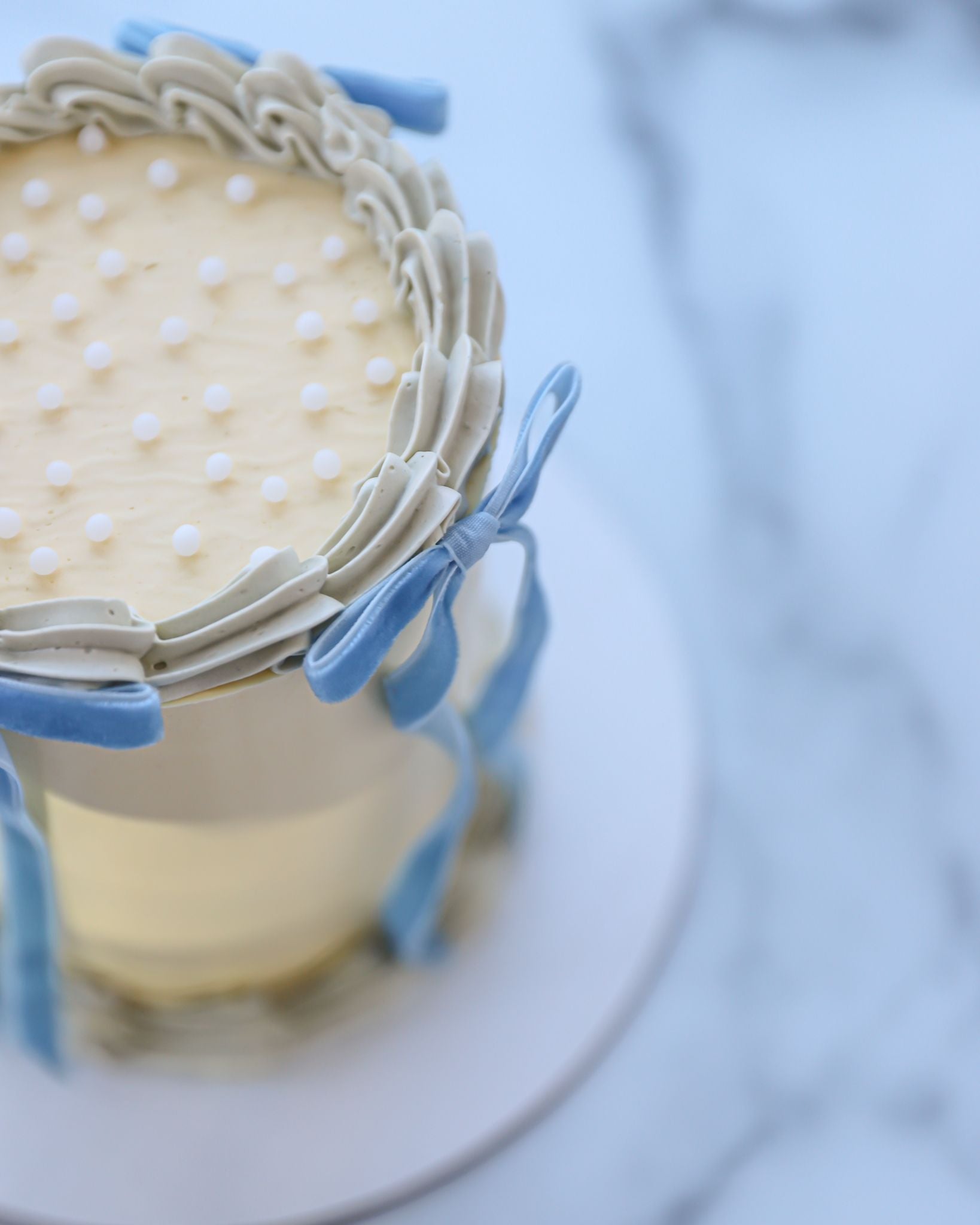 Add a touch of vintage elegance to your celebration with our Bluebell Bow Mini Cake. This delightful 4-inch treat is the perfect size for intimate gatherings or as a charming centerpiece. Featuring smooth buttercream in soft yellow tones and adorned with delicate grey piping and sweet blue velvet bows, it blends sophistication with a playful twist. Available in a variety of irresistible flavors, including gluten-free and vegan options, this mini cake makes a beautiful and delicious addition to birthdays, tea parties, baby showers, or simply as a special treat just because.