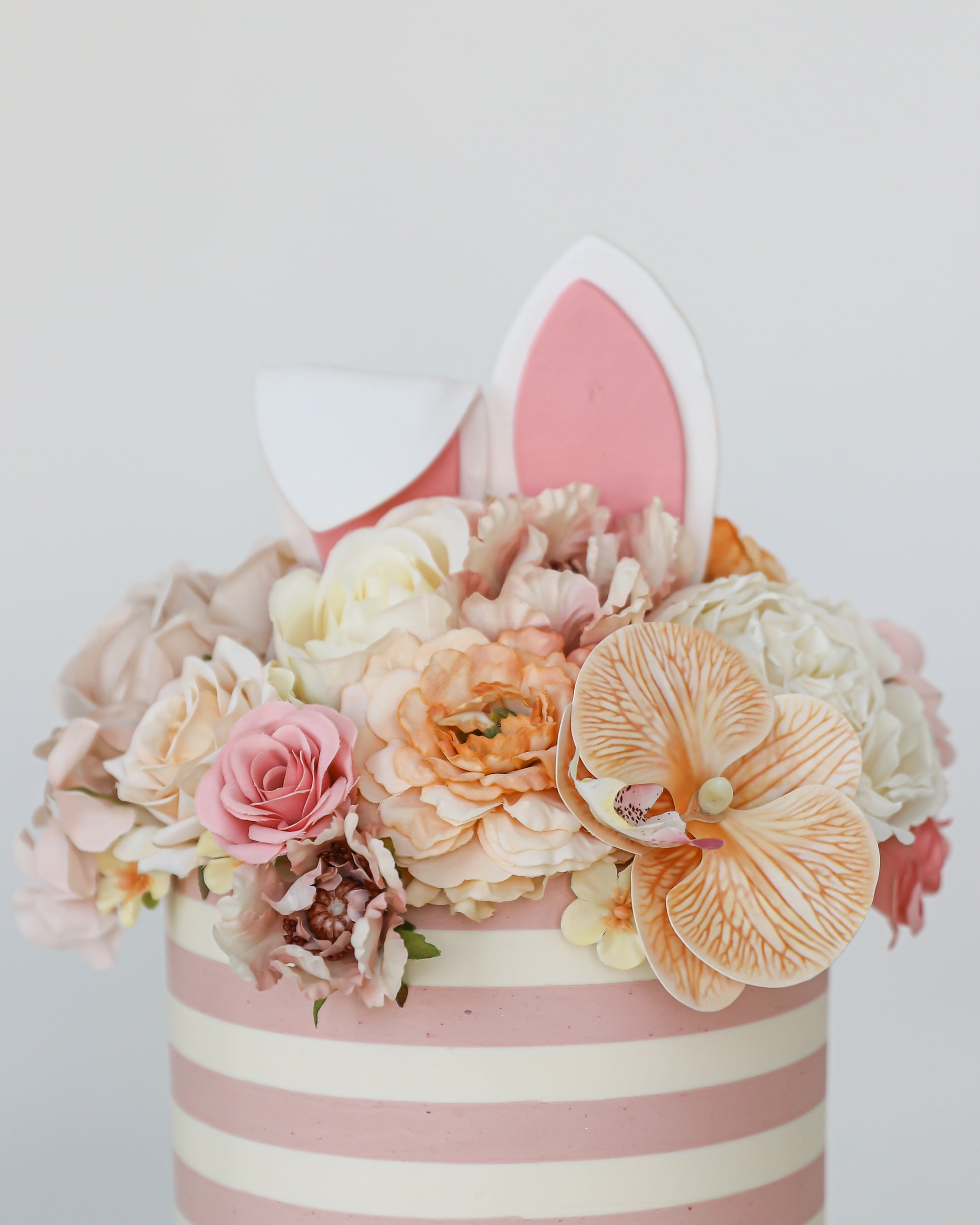 Celebrate the magic of spring with our charming Whiskers and Wishes Bunny Cake, a playful Easter centerpiece designed to bring joy and whimsy to your holiday table. This beautifully decorated cake features soft pastel buttercream stripes and is crowned with an abundant arrangement of florals and delicate spring blooms.